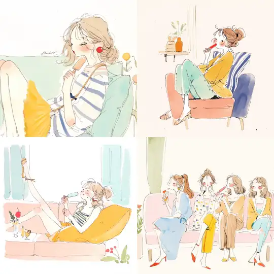 Midjourney Bot 更新时间:2025-01-03 00:20A set of pen light watercolor character illustrations, featuring simple hand-drawn lines and a fresh pen light color palette, depicting a woman sitting on a sofa eating an ice pop, rendered in the character style of Dutch artist Gozde Eyce. --sref