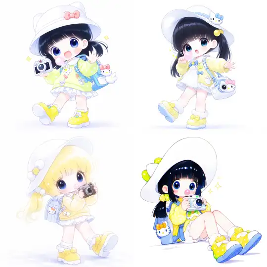 Midjourney Bot 更新时间:2025-01-03 00:21A cute little girl with a side ponytail, a white Hello Kitty hat, big eyes, blue eyes, sparkling, wearing a light yellow cartoon sweater, a light blue suspender, blowing bubble gum in her mouth, carrying a backpack, holding a Hello Kitty camera, wearing light yellow shoes, standing on a pure white background, dynamic posture, dynamic angle, subculture style, close-up, --niji 6 --ar 1:1 --style raw --s 800 --p ngwfcav