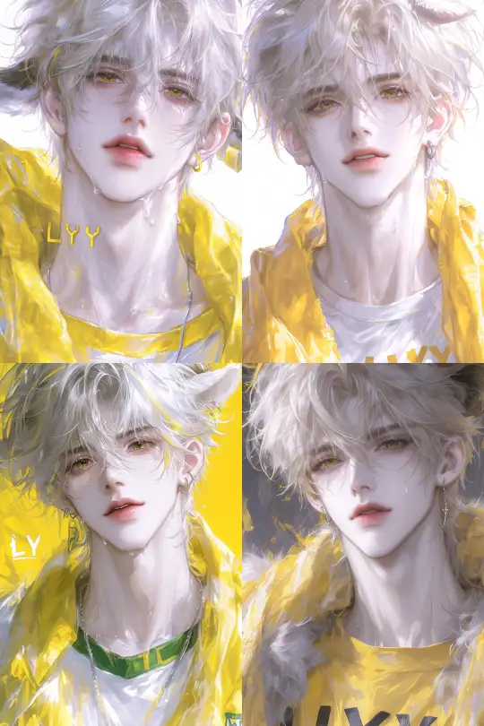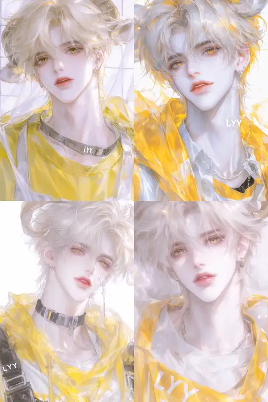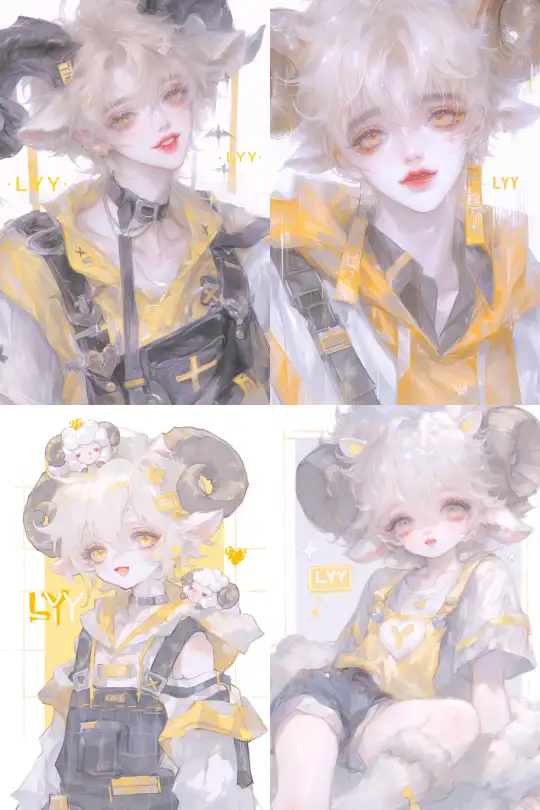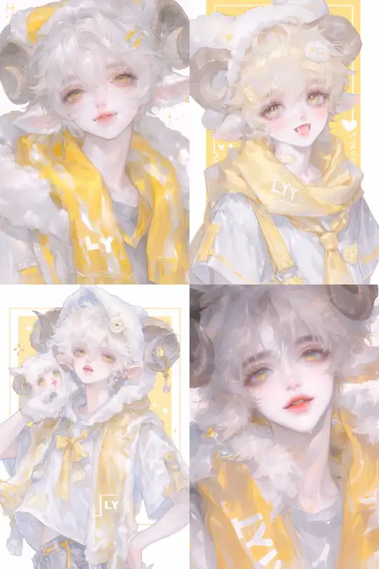 Midjourney Bot 更新时间:2025-01-03 00:28A handsome male teenager, a personified Lazy Sheep, with short light yellow ice cream hair, thick bangs, yellow eyes, slightly curled lips, a pair of straight brown sheep horns on his head, fair skin, exquisite features, wearing a yellow bib around his neck, a yellow short-sleeved T-shirt, and the letters "LYY" on a yellow background. --niji 6 --ar 2:3 --style raw --s 1000 --p cufsr7t