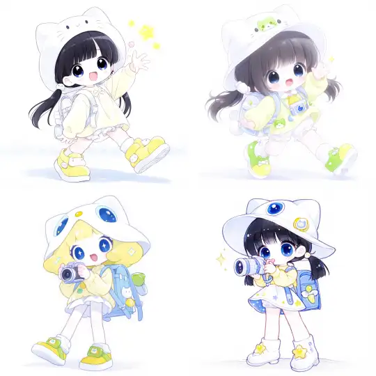 Midjourney Bot 更新时间:2025-01-03 00:23A subculture little girl, with a side ponytail, wearing a white Kitty Cat hat, big eyes, blue eyes, sparkling, dressed in a light yellow cartoon sweater, light blue suspenders, blowing bubble gum, carrying a backpack, holding a Kitty Cat camera, wearing light yellow shoes, standing, pure white background, dynamic posture, dynamic angle, subculture style, close-up, --niji 6 --ar 1:1 --style raw --s 800 --p ngwfcav
