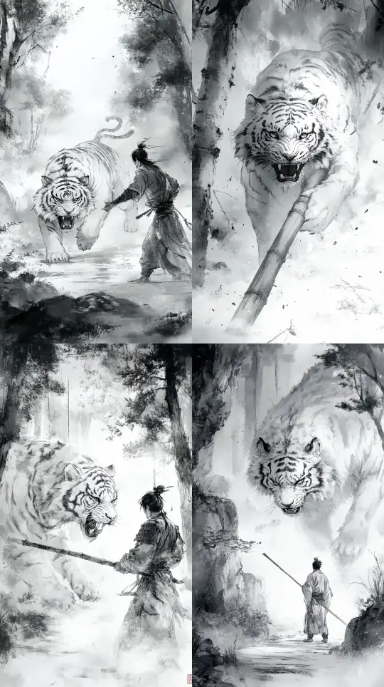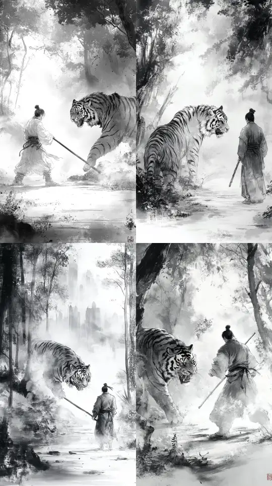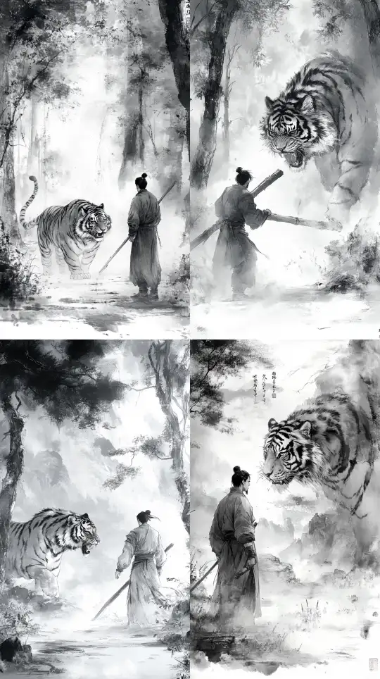 Midjourney Bot 更新时间:2025-01-03 00:30In ancient China, Wu Song used a massive wooden stick to knock the tiger down to the ground. --sref