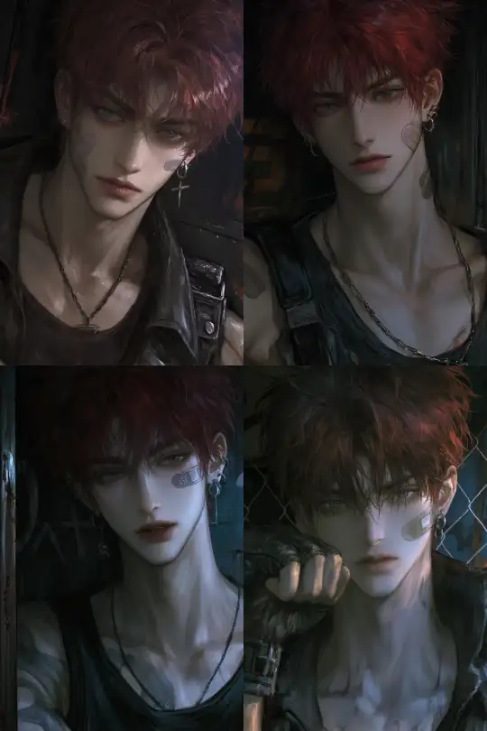 Midjourney Bot 更新时间:2025-01-03 00:30A man with a red pompadour hairstyle, wearing a black tank top, standing in the corridor, boxer, with a band-aid on his face, tiger teeth, gray eyes, noble, indifferent, model-like, aloof, thick eyebrows, leather texture, black earrings, upper body portrait, high-definition close-up. --niji 6 --ar 2:3 --s 360 --p kci3hd6