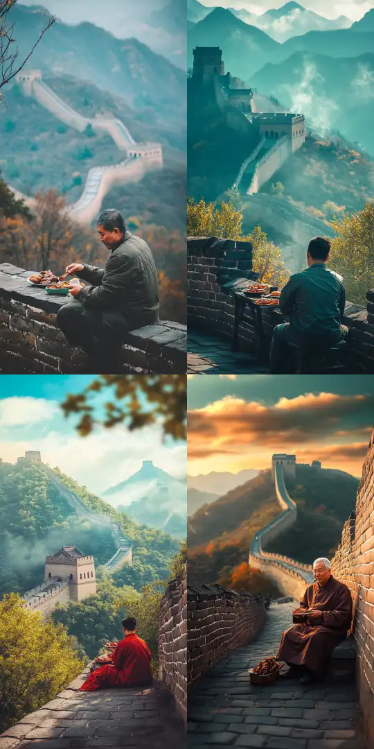 Midjourney Bot 更新时间:2025-01-02 00:15Realistic style, a Chinese male sitting on the Great Wall eating barbecue, medium shot, 2K quality --v 6.1 --ar 1:2