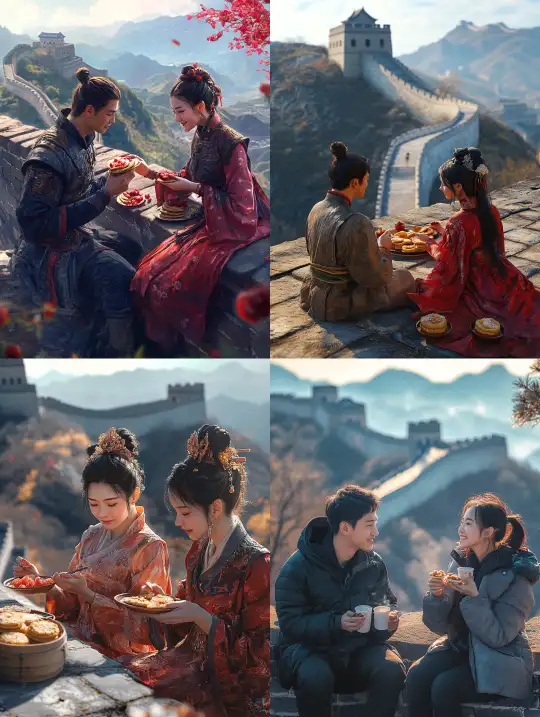 Midjourney Bot 更新时间:2025-01-02 00:16Realistic style, a Chinese male and a Chinese female sitting on the Great Wall of China eating candied hawthorn and pancakes, close-up shot, 2K quality --v 6.1 --ar 3:4
