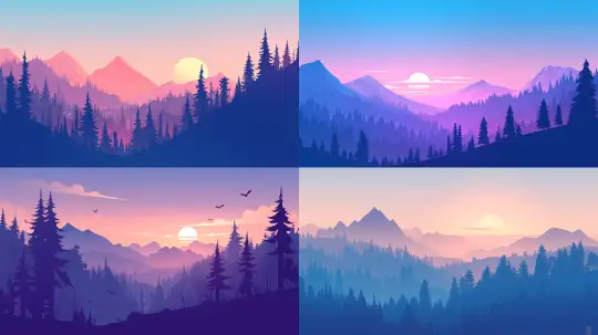 Midjourney Bot 更新时间:2025-01-02 00:18Vector illustration of mountains and forests, sunrise, simple flat design, vector art, simple shapes, gradient background, purple, pink, and blue color scheme, white space, suitable for banners, posters, or website backgrounds, minimalist style. --niji 6 --ar 16:9