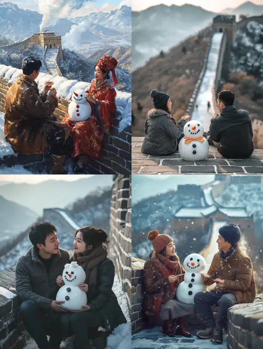 Midjourney Bot 更新时间:2025-01-02 00:18Realistic style, a Chinese man and a Chinese woman are sitting on the Great Wall facing the camera, eating a snowman shaped Bingtanghulu, close shot, 2K quality --v 6.1 --ar 3:4