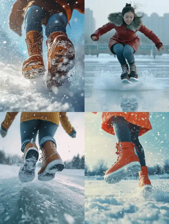 Midjourney Bot 更新时间:2025-01-02 00:20A Chinese woman rides on leather shoes, speeding over ice and snow, close-up shot, 4K quality. --v 6.1 --ar 3:4