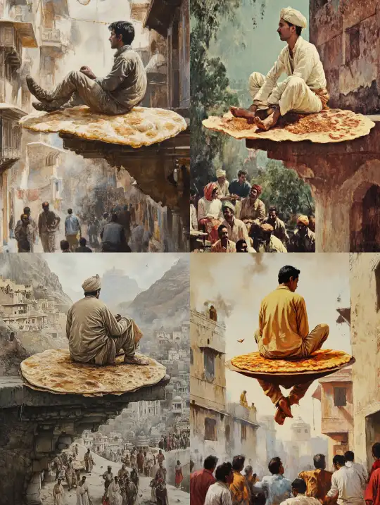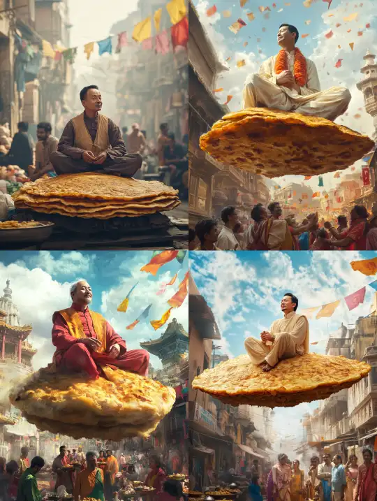 Midjourney Bot 更新时间:2025-01-02 00:22A Chinese man sits on an Indian flatbread, watching the Indian people below. --v 6.1 --ar 3:4