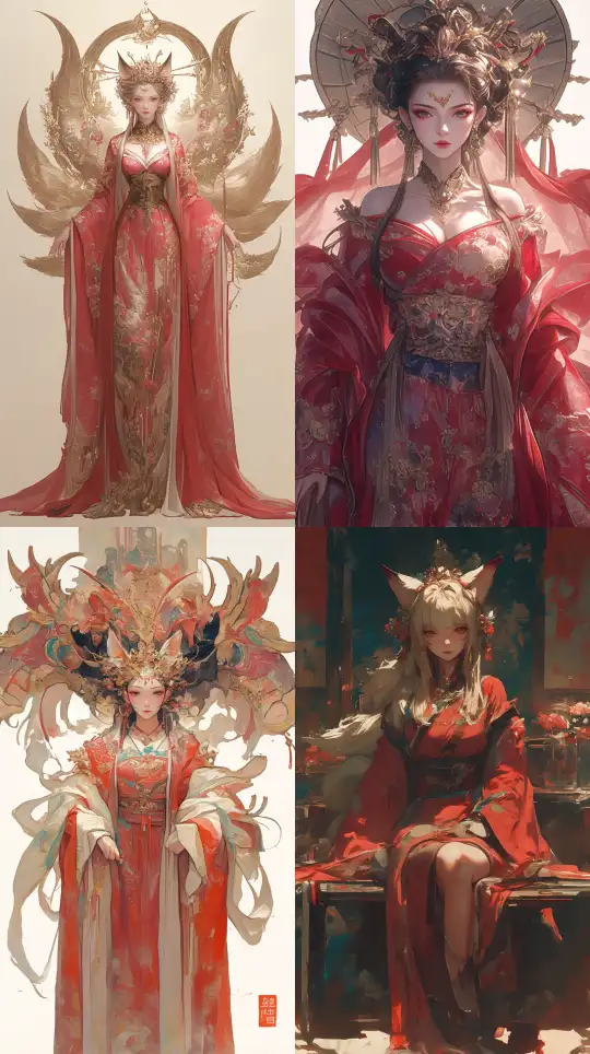Midjourney Bot 更新时间:2024-12-31 00:20Full-body shot, white background, the scene only features the character, a traditional Chinese mythological figure Daji, with a fox tail and ears, dressed in luxurious Chinese clothing, predominantly red, with peonies and phoenixes on the dress. A wide belt is tied around the waist, embroidered shoes on the feet, and wearing a phoenix crown adorned with various jewels and hairpins. --cref