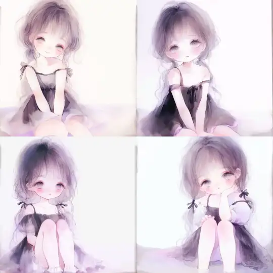 Midjourney Bot 更新时间:2024-12-31 00:27light watercolor, Pure white background, upper body, a girl, melancholic, Q-version, brown hair, low ponytail, wearing a dress with shoulder straps, sitting on the ground, looking up --sref