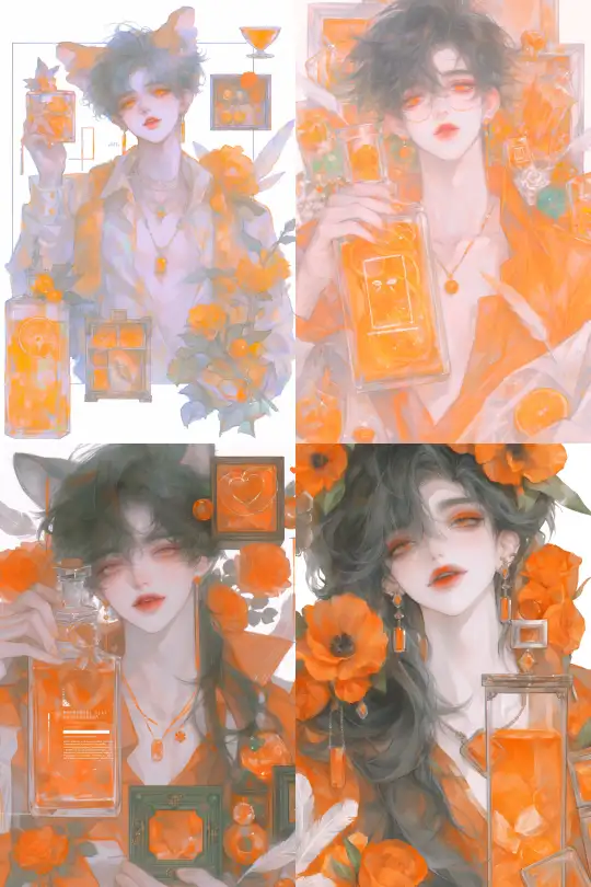 Midjourney Bot 更新时间:2025-01-01 00:01A handsome anime boy with long black hair and orange eyes, wearing a light orange shirt covered in orange patterns, holding a large glass bottle filled with orange juice, surrounded by various items such as orange flowers, a jewelry box, feathers, a jade pendant, orange jelly, orange sticks, and orange crystals. Super big eyes.. --niji 6 --ar 2:3 --style raw --s 1000 --p 9e8ib9j