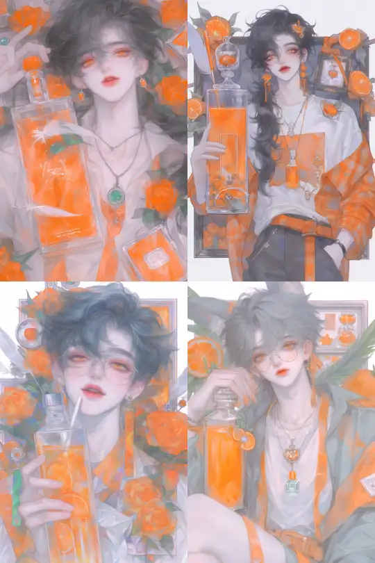 Midjourney Bot 更新时间:2025-01-01 00:00A handsome anime boy with long black hair and orange eyes, wearing a light orange shirt covered with orange patterns, holding a large glass bottle filled with orange juice, surrounded by various items like orange flowers, a jewelry box, feathers, a jade pendant, orange jelly, orange sticks, and orange crystals. Super big eyes. --niji 6 --ar 2:3 --style raw --s 1000 --p 9e8ib9j
