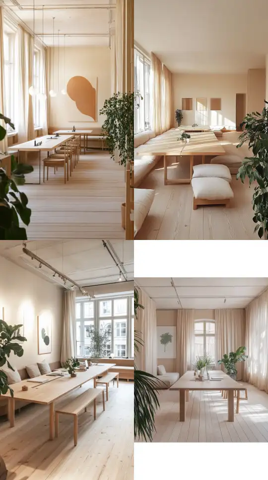 Midjourney Bot 更新时间:2025-01-01 00:02Imagine a warm and elegant open workspace of about 50 square meters, with the surrounding walls painted in a soft beige color and the floor covered in light wooden flooring. In the center is a large and comfortable long table, equipped with minimalist office supplies and green plants, creating a blend of nature and work. Next to the working area are several cozy corners, furnished with soft sofas and some exquisite coffee tables, while inspiring artworks hang on the walls, adding to the creative atmosphere. On either side of the windows are flowing sheer curtains that let sunlight in, creating a bright and warm sense of space. The flexible layout allows the team to rearrange the furniture as needed, maintaining efficiency and comfort at all times, providing each worker with a cozy, motivating, and creatively rich environment. danish interior design,Alvar Aalto, --v 6.1 --ar 9:16