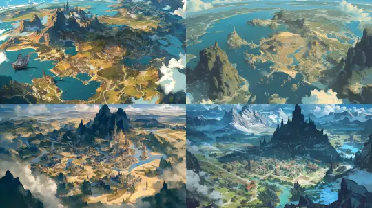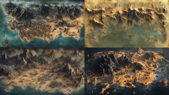 Midjourney Bot 更新时间:2024-12-31 00:02A flat map, European style, with towering mountains to the north shrouded in black mist, an urban area to the east of the continent, separated from another city by a distance, a desert to the south of the continent, and a city to the west by the sea. --v 6.1 --ar 16:9 --style raw