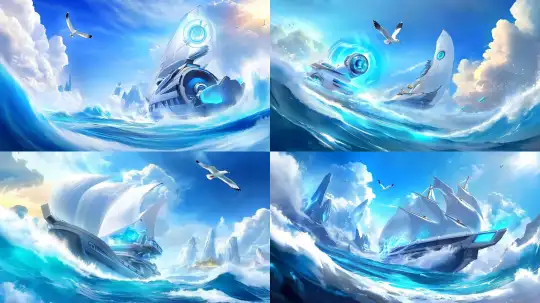 Midjourney Bot 更新时间:2024-12-31 00:06A ship, sailing on the sea, facing huge waves, with a seagull flying over the sky --sref