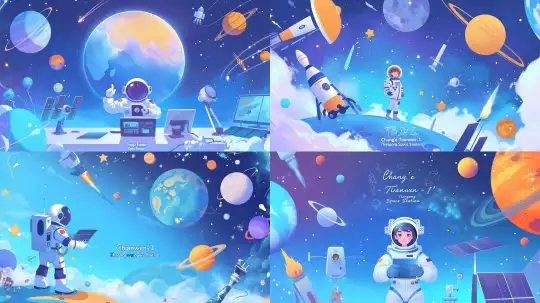 Midjourney Bot 更新时间:2024-12-30 00:13China Science and Technology Display Frame, with the title in the center: China Modern Science and Technology, surrounded by "Chang'e" probe, "Tianwen-1" probe, "Zhurong" Mars rover, "Tiangong Space Station", satellites, solar panels, master-level composition, cartoon animation style --sref