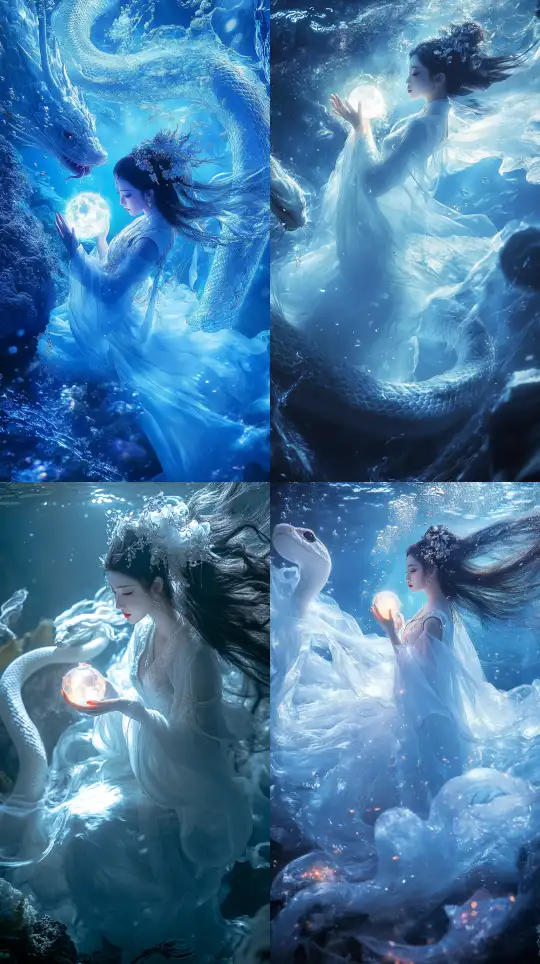Midjourney Bot 更新时间:2024-12-30 00:00Super large scene, Chinese underwater photography, deep sea, a beautiful water goddess wearing an elegant white hanbok, the goddess holding a glowing crystal ball, surrounded by a giant white snake, the small figure and the large snake create a striking contrast, forming a perfect composition, blue light, ultra-high-definition details, high-resolution full-body photo, fantasy style, mysterious atmosphere and deep colors. --v 6.1 --ar 9:16 --style raw