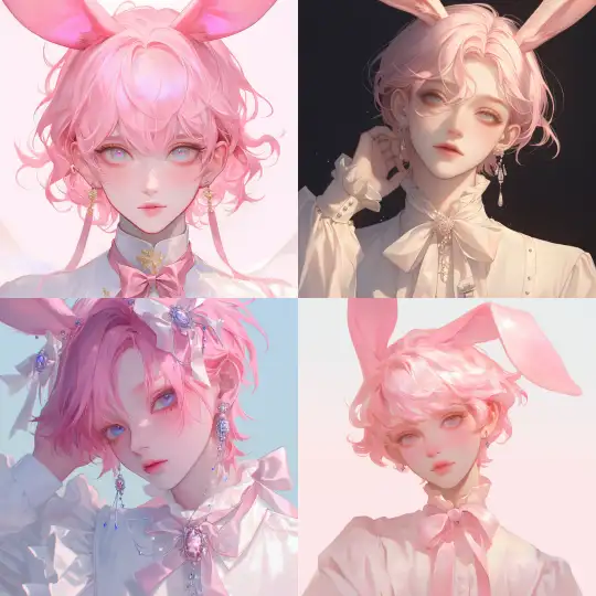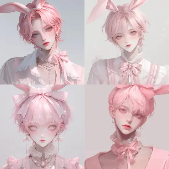 Midjourney Bot 更新时间:2024-12-30 00:03A cute male bunny eared teenager with pink hair, delicate face, long eyelashes, cute round eyes, intricately detailed upper body portrait, decorated with ribbon bows, pink bunny ears on his head, shy ☺️, Cute pink European style dress, elegant young man, earrings and lip studs, elegant handsome man, ultra high definition --niji 6 --ar 1:1 --style raw
