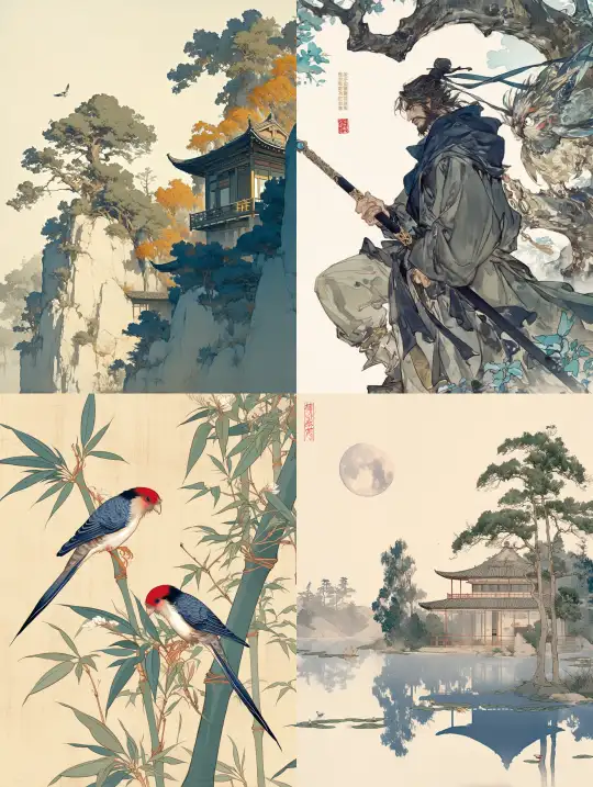 Midjourney Bot 更新时间:2024-12-29 00:10Song embroidery, Journey to the West Second Master History, advanced color matching, telephoto lens, Song Huizong style, background Song Dynasty Xuan paper, national trend, ultra-high quality --niji 6 --ar 3:4 --no person --s 589