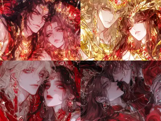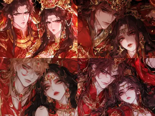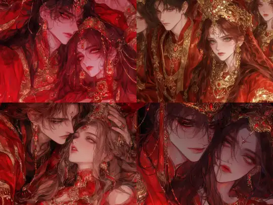 Midjourney Bot 更新时间:2024-12-28 00:05A cartoon illustration in ancient Chinese style depicting an emperor and empress. The boy is handsome and tall, with imperial status, a golden crown, ancient long hair, and dressed in red Hanfu. He wears exquisite jewelry on his face, chest, and surroundings, many of which are golden and float like stars. The other girl is beautiful and charming, dressed in gorgeous empress attire and wearing a crown on her head. They were all wearing Tang Dynasty Hanfu, surrounded by a red halo. The two are symmetrical on both sides. Hd, 8K resolution, animation, animation aesthetics, bringing ultimate aesthetic impact, dynamic posture, ultimate contrast between light and dark, masterpiece, master's work --niji 6 --ar 4:3 --style raw --s 1000 --p spr1pcg