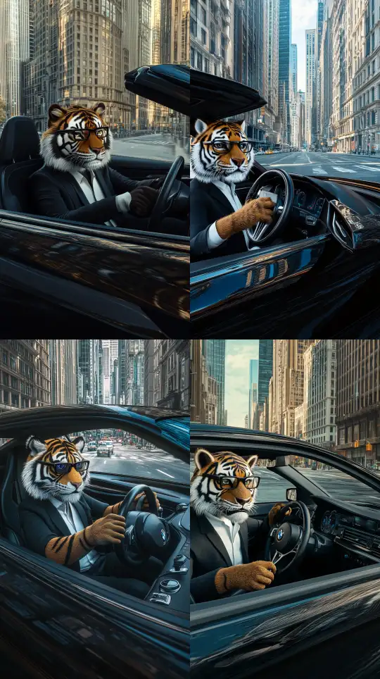 Midjourney Bot 更新时间:2024-12-28 00:09A humanoid tiger is driving a black BMW car on the city streets, with interior design of the car, sitting in the left driver's seat holding the steering wheel, super realistic photography, the tiger wearing a pair of black framed prescription glasses, dressed in a black suit and white shirt, ultra-wide angle, with a car roof, panoramic view inside the car, looking out through the car's windshield, outside the car window are the city's high-rise buildings, highly detailed edge lighting, realistic fur texture, realistic details, National Geographic shooting, real light tracking, super realism, particle effects, real texture, ultimate picture quality, detailed depiction, dynamic design, Chungking Express style, cinematic lighting, ultra HD, fine details, color grading, 32K HD--Section 6.1--Section 9:16 --v 6.1 --ar 9:16 --no Deformity,