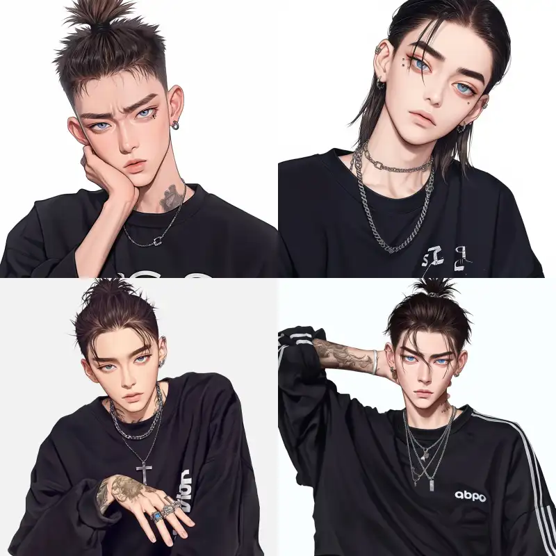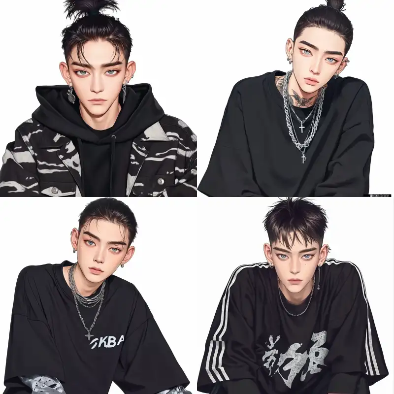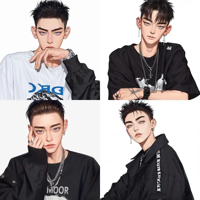 Midjourney Bot 更新时间:2024-12-25 00:07A handsome and slightly rebellious man, hair combed back to reveal his forehead, wearing cool clothing, sharp eyes, front view, half-body, pure white background --sref
