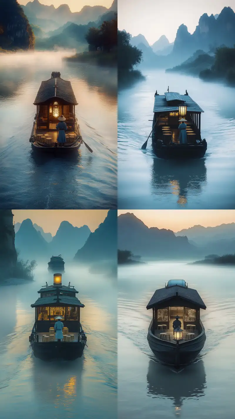 Midjourney Bot 更新时间:2024-12-25 00:07Before dawn, a wide river shrouded in mist. A Chinese ancient ferry with a cabin slowly approaches. A Chinese ancient boatman stands at the bow, paddling with both hands, facing the riverbank. He is tall and wears a wide-brimmed hat. The ferry's hull is made of ebony, emitting a faint blue light. A cylindrical lantern hangs on the cabin, illuminating the hazy path ahead. 4 or 5 simple bamboo stools are placed in the cabin. Distant mountains are vaguely visible, stretching endlessly. The boat is surrounded by white mist. Ultra-wide angle, long shot, frontal shoulder-level perspective, realistic, dreamy texture, dynamic design, framed composition, balanced design, cinematic lighting, ultra-high definition, fine details, color grading, the main colors of the image are light gold and emerald green, 32K HD Section 6.1 Section 9:16 --v 6.1 --ar 9:16 --no Deformity,