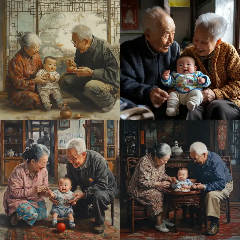 Midjourney Bot 更新时间:2024-12-25 00:09Scenes of Chinese grandparents playing with a baby. --v 6.1 --ar 1:1