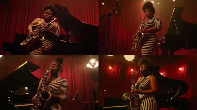 Midjourney Bot 更新时间:2024-12-26 00:01This picture shows a 40 year old woman with black skin wearing striped clothes playing the saxophone on stage. This woman has a slightly overweight figure, with a dark red backdrop and a black grand piano. The saxophonist stands in the center of the stage, focused on playing the instrument. This is a screenshot of a 3D American anime style video clip or music performance. The whole scene conveys a feeling of a live concert. --sref