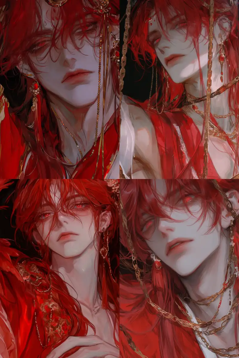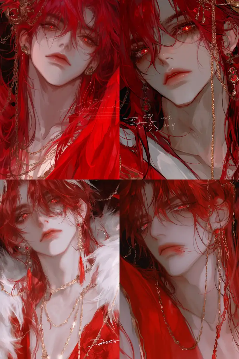Midjourney Bot 更新时间:2024-12-26 00:03A handsome male teenager, tall, cold and noble, with long red hair, ancient tied hair, M-shaped bangs, flowing and soft hair, delicate and glossy hair, calm expression, big red eyes, dilated pupils, glowing eyes, red lips, closed mouth, exquisite facial features, perfect, delicate facial features, standing, red ancient Hanfu, Hanfu decorated with gold chains, embroidered on clothes, golden bird wings extending from the back, bird crown on the head, red series, dark red background, close-up shot of the upper body, facial focus, 32K image quality, high image quality, high resolution, ultimate details, masterpiece, fine, ultra clear, high detail, hand drawn. --niji 6 --ar 2:3 --style raw --s 1000 --p spr1pcg