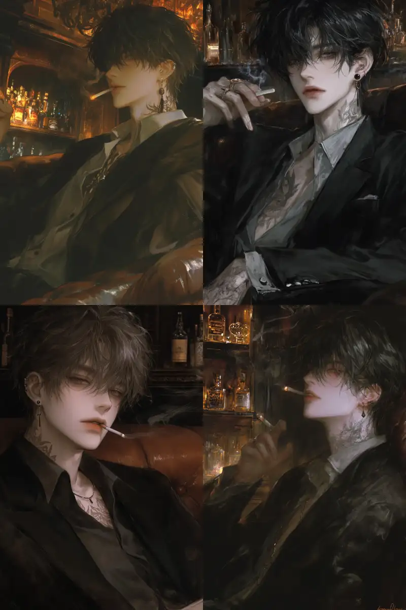 Midjourney Bot 更新时间:2024-12-26 00:04A man with a big black back, wearing a black suit, sitting on a leather sofa in a bar, tattooed, gray eyes, noble, indifferent, model like, aloof, smoking, thick eyebrows, black earrings, upper body portrait, high-definition close-up --niji 6 --ar 2:3 --s 360 --p kci3hd6