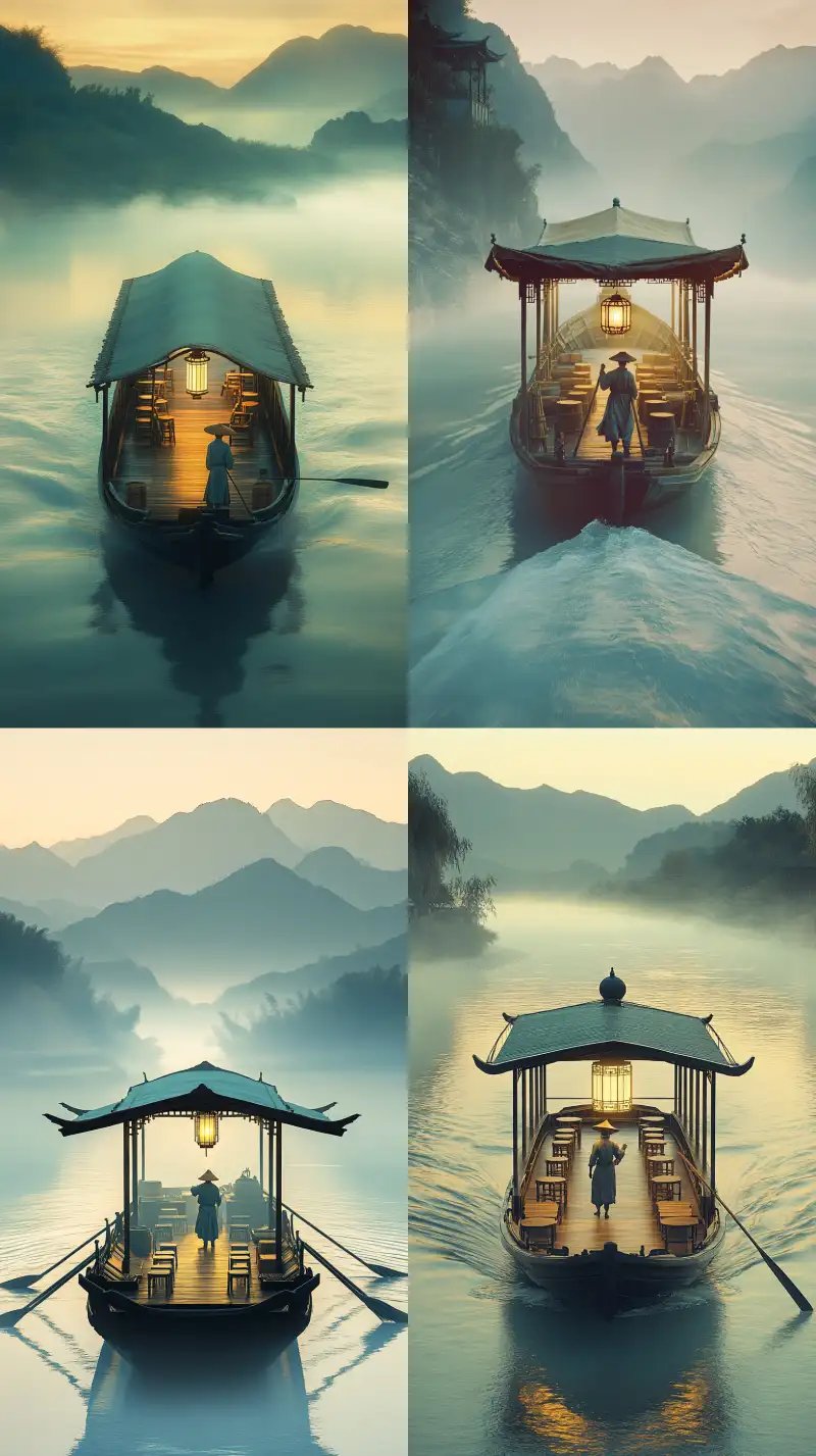 Midjourney Bot 更新时间:2024-12-25 00:04Before dawn, a wide river shrouded in mist. A Chinese-style ancient ferry with a canopy slowly approaches. A Chinese ancient boatman stands at the bow, paddling with both hands, facing the riverbank. He has a tall figure and wears a wide-brimmed hat. The ferry's hull is made of ebony, emitting a faint blue light. A cylindrical lantern hangs from the canopy, illuminating the hazy path ahead. Four or five simple bamboo stools are placed in the cabin. Distant mountains are vaguely visible, stretching endlessly. The boat is surrounded by white mist. Ultra-wide angle, long shot, parallel perspective, realistic, dreamy texture, dynamic design, framed composition, balanced design, cinematic lighting, ultra-high definition, fine details, color grading. The main colors of the image are light gold and emerald green. 32K HD--Section 6.1----Section 9:16 --v 6.1 --ar 9:16 --no Deformity,
