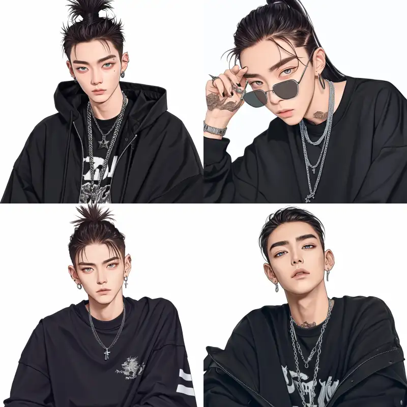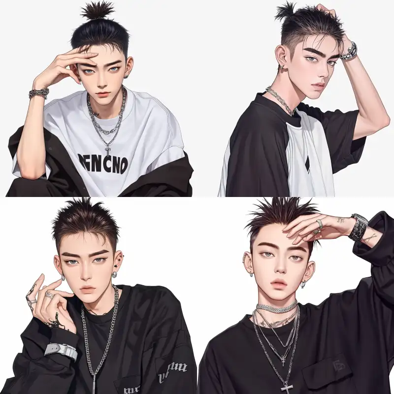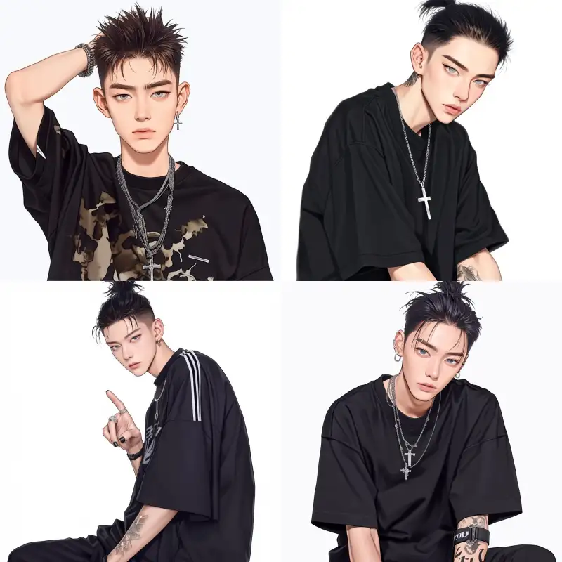 Midjourney Bot 更新时间:2024-12-25 00:06A stylishly rebellious man, with a Hong Kong-style slicked-back hairstyle, hair combed back to reveal his forehead, wearing cool clothes, sharp eyes, front view, half-body, pure white background --sref