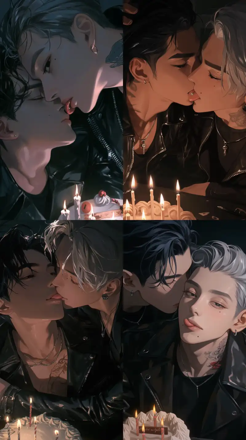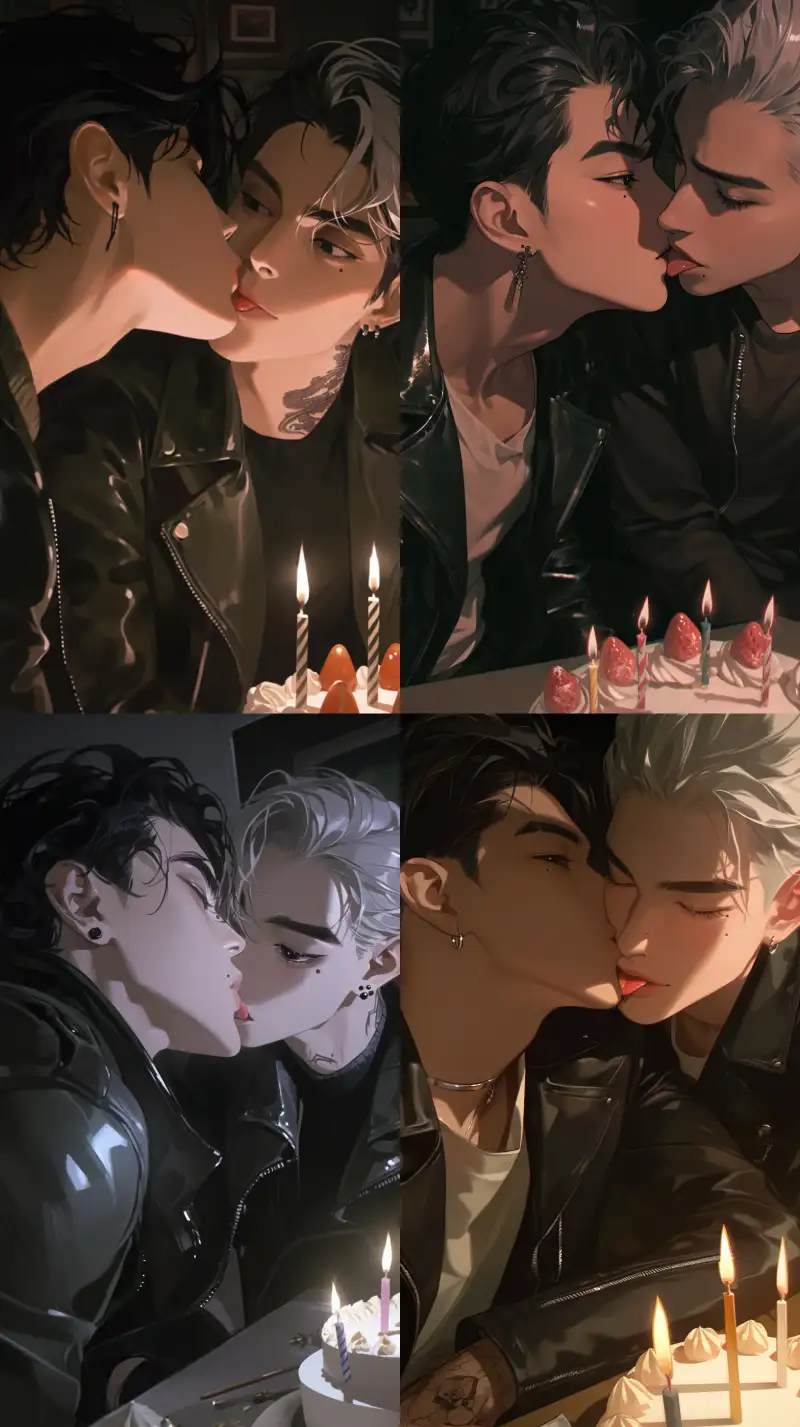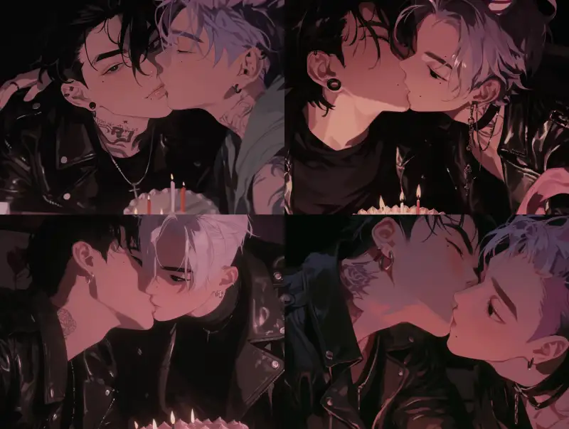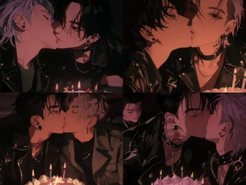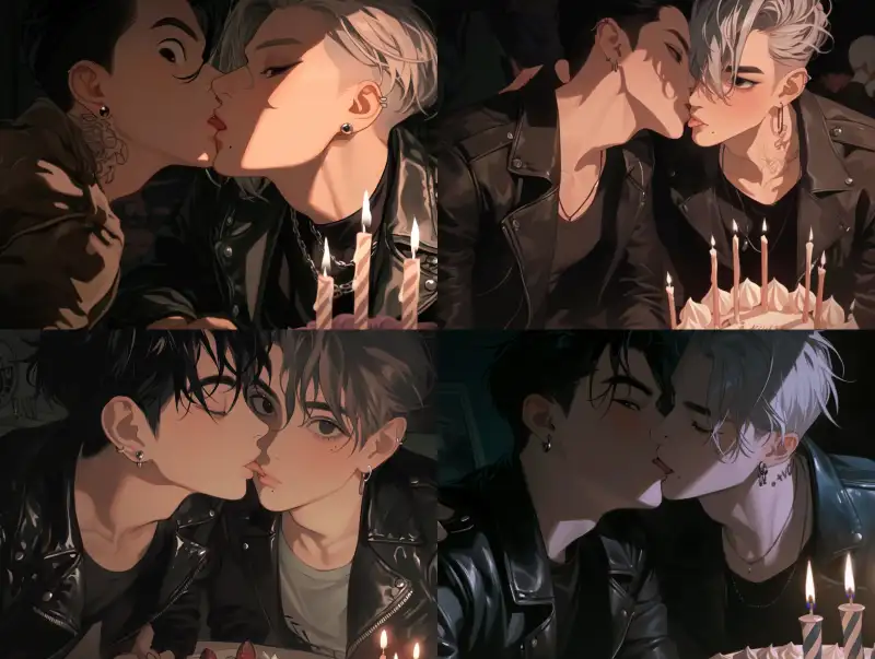 Midjourney Bot 更新时间:2024-12-22 00:14Two men are kissing from a flat perspective, with their tongues and two boys sitting side by side. The male focus is on a handsome boy with black hair and a leather jacket, and a beautiful boy with a silver short haircut and a light pink tail. He is depicted in a Korean manga with a closed mouth, a portrait, extremely thin hair, long eyelashes, stunning and stunning. His eyes are stunning with hazy beauty, details, close-up portraits, modern and romantic manga, super detailed illustration style, digital art style, ultra-high resolution, black background, sinister and arrogant. Handsome is just one word, pulled, cold, normal person, cold, beautiful. Cold, modern, cold, beautiful, delicate facial features, extremely fine hair, cold, matte texture, textured, modern, small tattoos, extremely fine hair, detailed contours, half body image, 8k, metal earrings, black accessories, exquisite makeup, delicate facial features, detailed rendering, beautiful and gorgeous, perfect, charming, beautiful, perfect, male, gorgeous picture, perfect proportion, beautiful male, beautiful, up close, facial close-up, charming and attractive, matte texture, flat style, Korean manga, beautiful, slender, charming appearance, moles under the lips, birthday cake on the table, birthday, dim room, (birthday cake with candles on the table), (black pupils), joy, intimacy, happiness candlelight, Candlelight, --sref