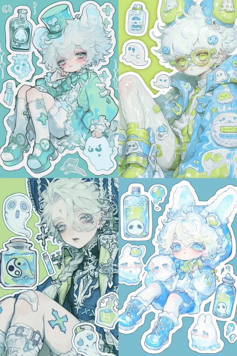 Midjourney Bot 更新时间:2024-12-22 00:05A sticker featuring a cute fantasy male teenager with a white ponytail, dressed in blue and green clothes, surrounded by ghost creatures, ghosts, yin-yang symbols, water bottles, and magic potions, with a light blue-green background. Ultra detailed painting concept art, with complex details and a style of fantasy illustration. --niji 6 --ar 2:3 --style raw --s 1000 --p spr1pcg