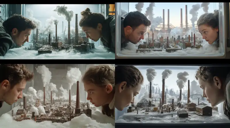 Midjourney Bot 更新时间:2024-12-22 00:09In the movie scene, there is a man and a woman with their faces facing the camera, and their faces can be clearly seen. They are hunched over, observing the frozen refrigerator freezer, a miniature 3D urban landscape inside, a smoke filled industrial area, including tall chimneys, factories, and bridges, --v 6.1 --ar 16:9 --no wrong finger, wrong hand