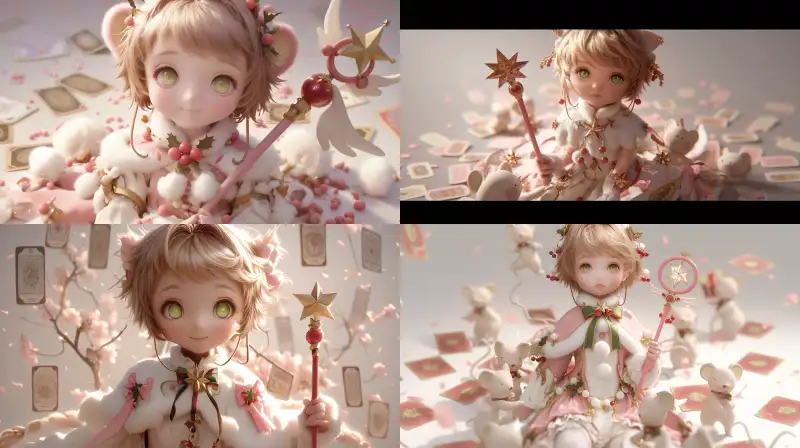 Midjourney Bot 更新时间:2024-12-22 00:10Kinomoto Sakura, a cute girl cub from the Magic Card Girl Sakura, has short reddish brown hair, two very short braids, tied with two cute cherry braids, a cute face, green eyes, holding a star scepter, Christmas clothing, surrounded by many tarot cards, cherry blossom petals, exquisite realism style, exquisite cute face, action shots, full body shots, blown skin, realistic style, starry sky eyes, very, beautiful, UHD, Details, accurate --sref