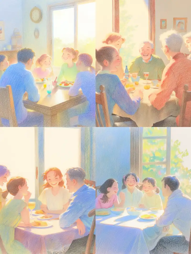 Midjourney Bot 更新时间:2024-12-13 02:36A colorful pencil drawing depicts a daughter, son-in-law, father, and mother sitting around a dinner table chatting, with the mother and daughter laughing happily; Dad is very serious, while son-in-law looks nervous. The proportion of four people in the picture is moderate. The entire work presents simple line art and soft warm tones. There are very obvious traces of colored lead and brushstrokes --sref