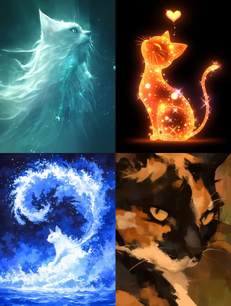 Midjourney Bot 更新时间:2024-12-13 00:54A cat made up of pixel particles, with a close-up of the outline, the particles deform with the contour, the pixel particles are dispersed, the black background is composed of dots, the edges are hazy, and the particle filter is used --v 6.1 --ar 3:4 --style raw --s 400 --c 20