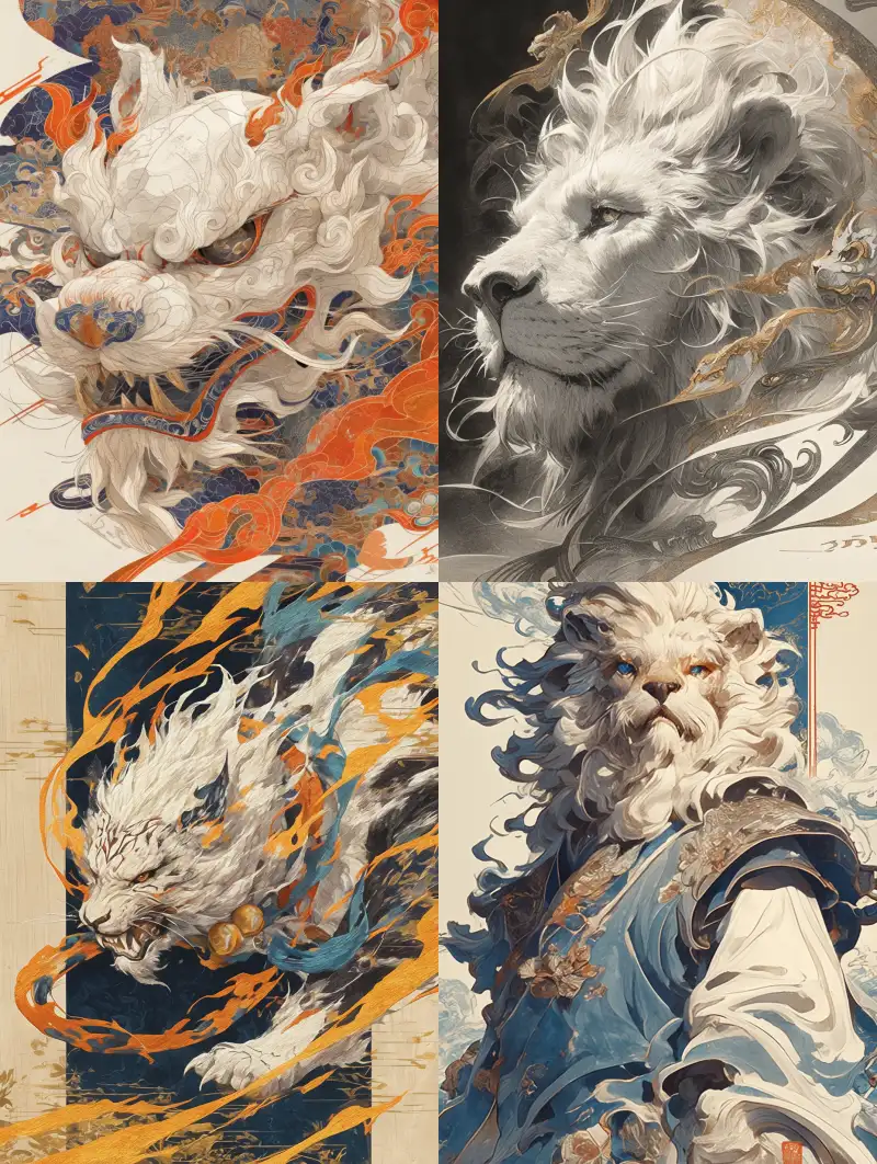 Midjourney Bot 更新时间:2024-12-12 00:03Su embroidery, fine lines, flame white lion, high-end color matching, the image adopts the artistic style of Emperor Huizong of Song Dynasty, high-end color matching, telephoto lens, ultra-high quality --niji 6 --ar 3:4 --no person --s 851