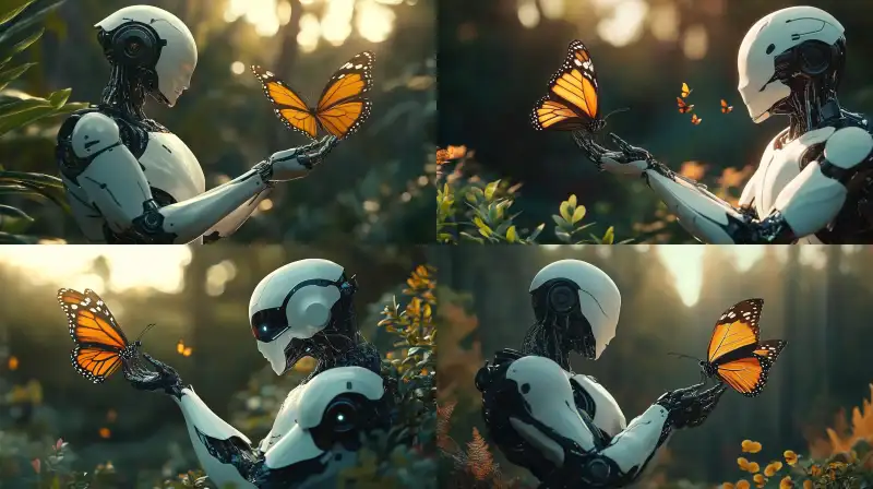 Midjourney Bot 更新时间:2024-12-12 00:03A photo of a humanoid robot holding a butterfly in the background of a garden, with sunlight, 3D rendering, close-up side view. Robots are white with black parts, while butterfly wings are orange. The background is blurred with green plants, giving an overall warm and natural appearance. High definition and delicate picture quality --sref