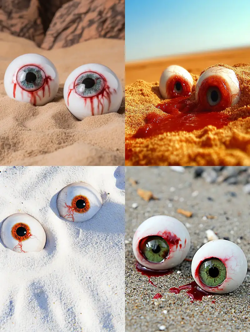 Midjourney Bot 更新时间:2024-12-12 00:18A pair of huge eyeballs abandoned in the sand, oozing red liquid. --v 6.1 --ar 3:4 --style raw --s 0 --c 26