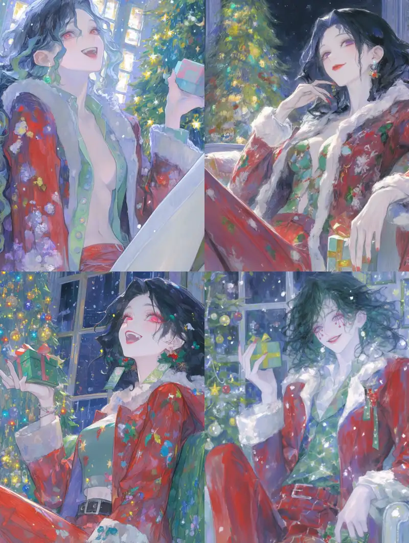 Midjourney Bot 更新时间:2024-12-11 00:10Kibutsuji Muzan from Demon Slayer, smiling, wearing a red Christmas coat and pants, holding a gift, sitting on the Christmas sofa next to the Christmas tree, with prominent facial expressions, soft natural light, detailed character illustrations, bright colors, 8K. --sref 234631 --niji 6 --ar 3:4 --no Close-up --s 300 --p mg5932m