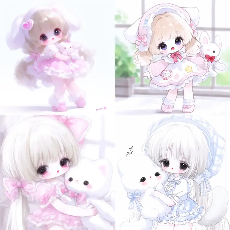 Midjourney Bot 更新时间:2024-12-11 00:15Q-cute, anime character Mofu☆Mofu, a girl with light brown hair in twin tails, wearing a cute light pink dress, standing and holding a kitten, with a white background, big eyes, thick painting style. --niji 6 --ar 1:1 --style raw --s 1000 --p ngwfcav