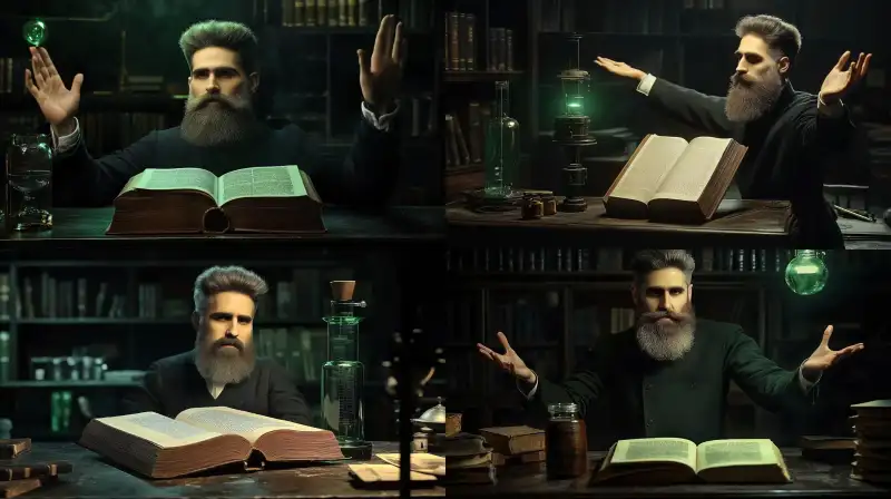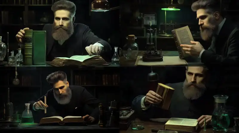 Midjourney Bot 更新时间:2024-12-06 00:06A scientist is holding a classical book in his hands. The book is bound, and his arm is extended forward, with the book standing on the table. The setting is a laboratory. --sref