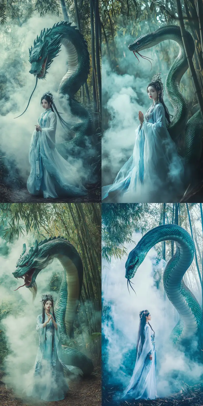 Midjourney Bot 更新时间:2024-12-06 00:124K, ultra clear, realistic photography style, full body image, wide-angle lens, a Chinese girl wearing traditional white and blue Hanfu, with a super huge Chinese mythical green snake standing behind her. The background is a bamboo forest with misty cooking smoke, giving people a mythical feeling like Chinese mythology --v 6.1 --ar 1:2