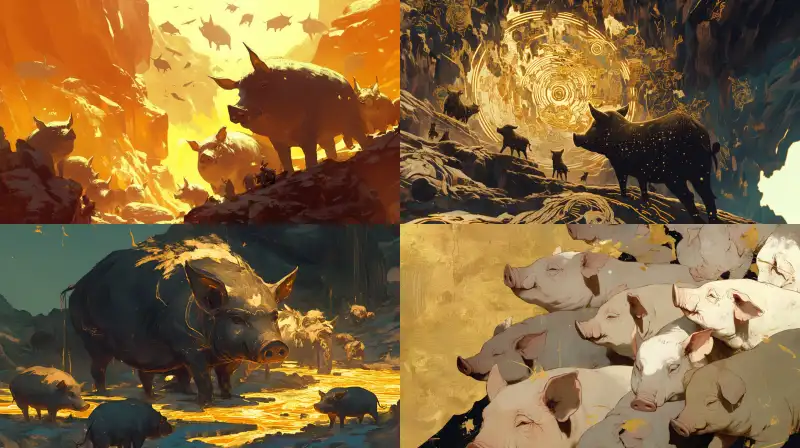 Midjourney Bot 更新时间:2024-12-03 00:09Inside the mountain, there are some earth pigs with golden line paintings, pure black background, 4K --niji 6 --ar 16:9 --no No fruits and vegetables