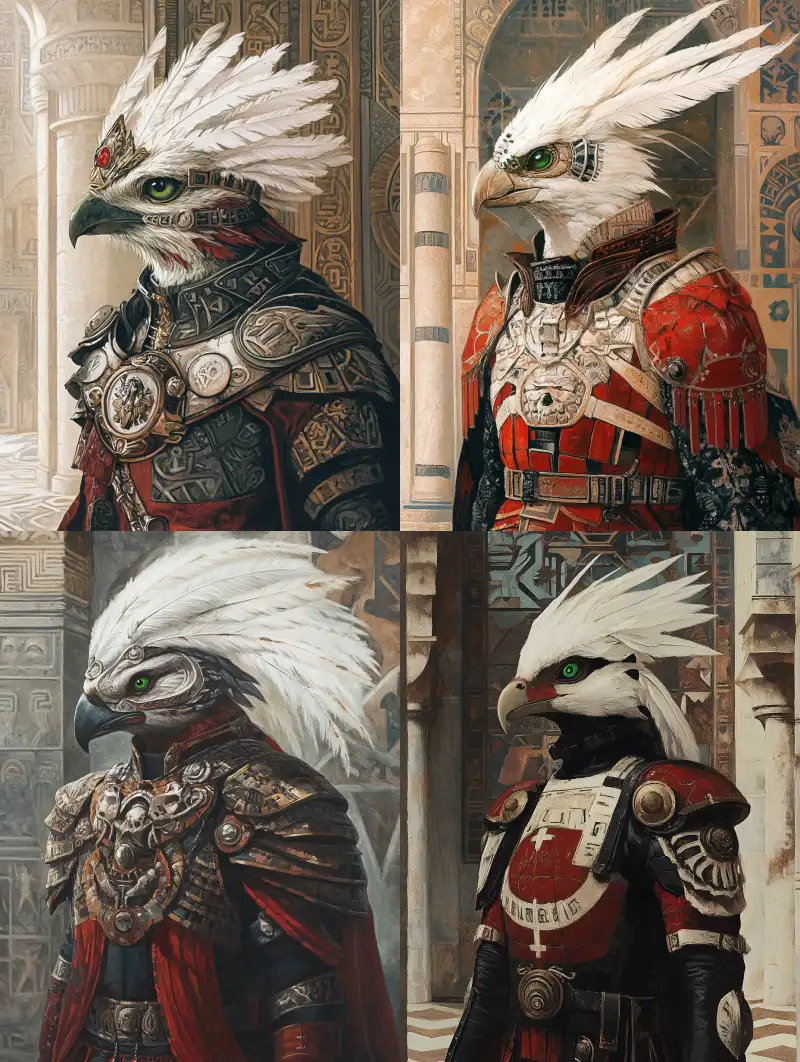Midjourney Bot 更新时间:2024-11-25 00:10This image depicts a bird-headed creature wearing a white feather crown and red and black armor. Its head is adorned with intricate carvings, and its eyes are green. The background features a mural with geometric patterns, primarily in gray and brown colors. The bird-headed creature stands inside what appears to be an ancient building, surrounded by columns and arches. Overall, the painting conveys a mysterious and ancient atmosphere. --v 6.1 --ar 3:4