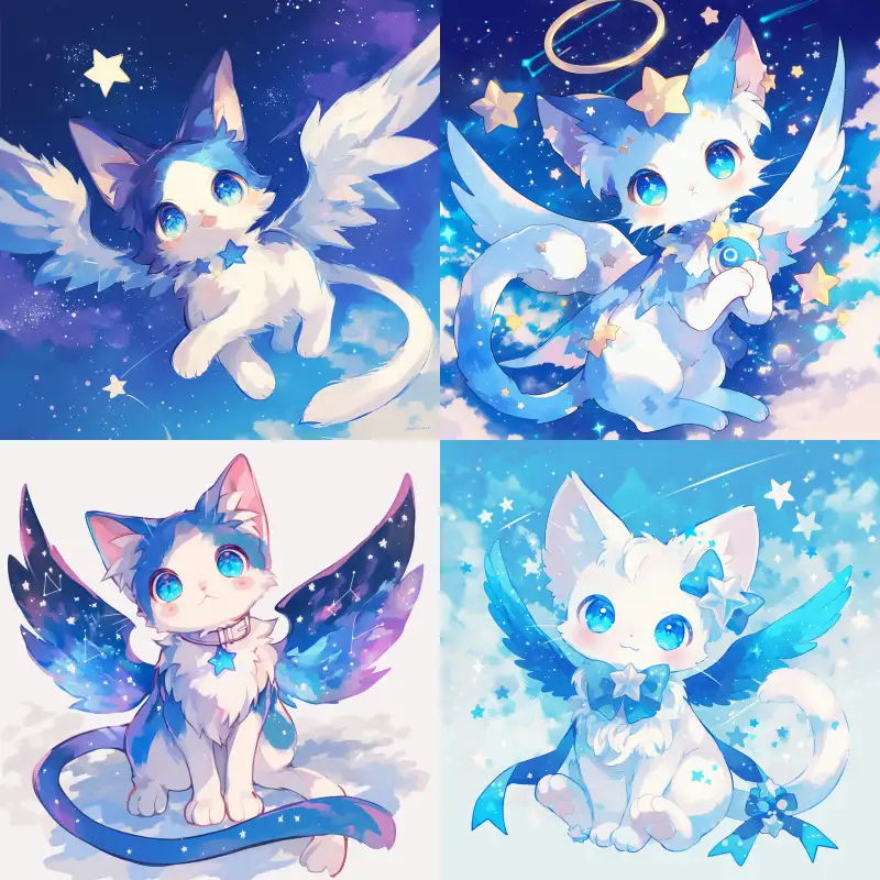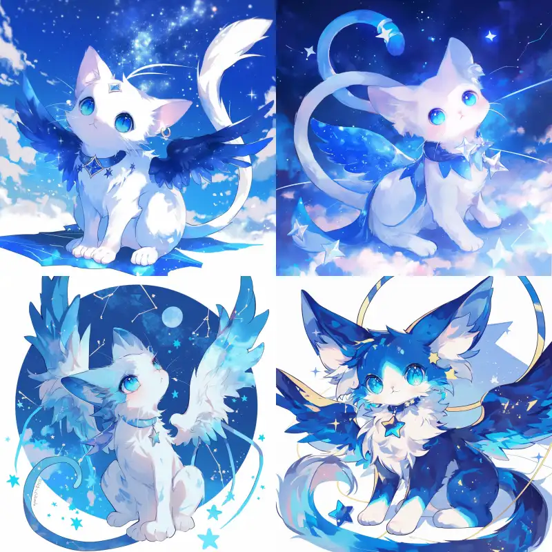 Midjourney Bot 更新时间:2024-11-25 00:11Blue and white cat, starry sky wings, starry collar, Pok é mon art style 16K, --cref