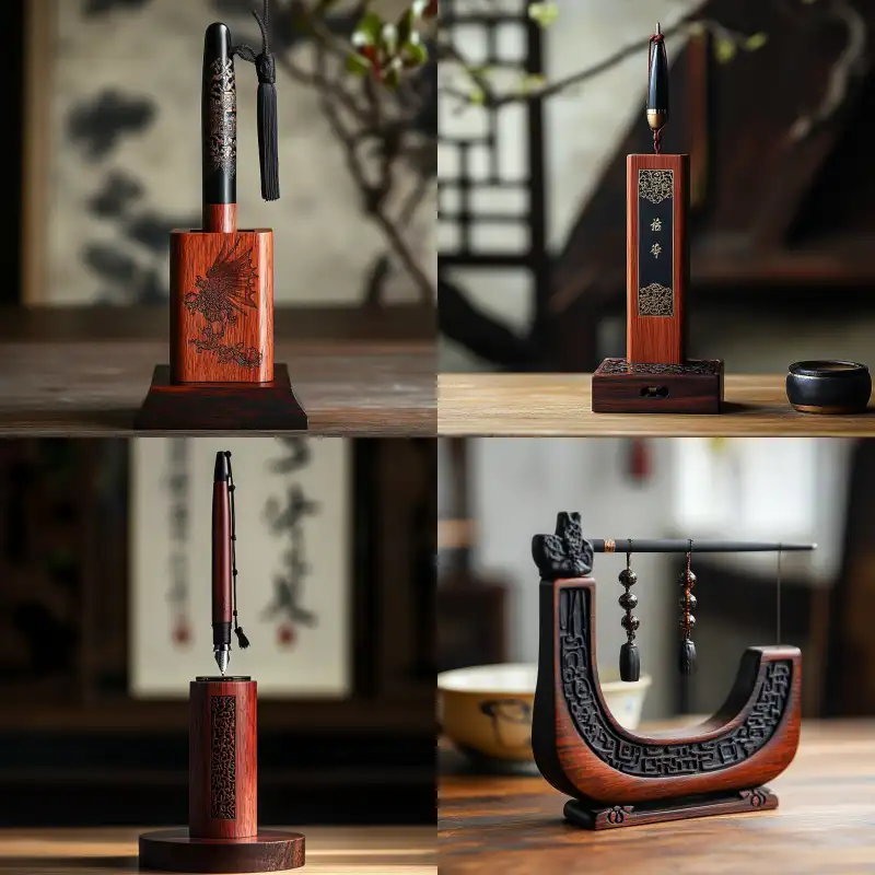 Midjourney Bot 更新时间:2024-11-24 00:05A desktop pen holder, made of red pear wood and ebony wood, suspended, with a Chinese Qin Dynasty aesthetic style, and a desktop handicraft ornament --v 6.1 --ar 1:1